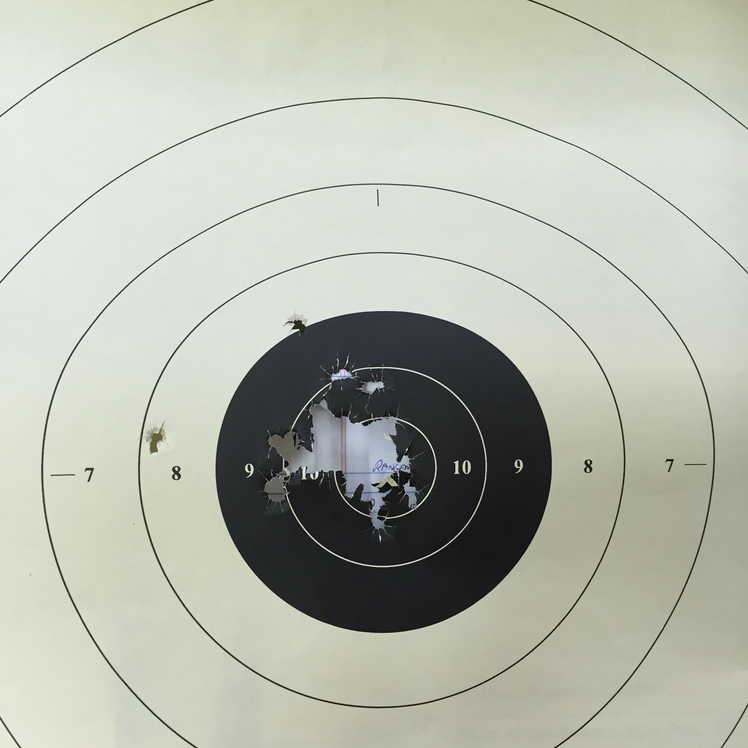 The first range work consisted of some dry presentations and then quickly moved into accuracy and trigger control drills.  This was followed by some diagnostic drills, and then several runs on the Rangemaster Bullseye Course.  Posted below is the target from my best run, a 295 out of 300, with my other two runs being a 284 and a 288.  The 284 was my first run.  I had a good group, but it was clustered high in 8-ring and the 9-ring.  After that, I went with a “six o’clock hold aligning the top edge of my front sight near the bottom the black, and this put the shots where I wanted them.
