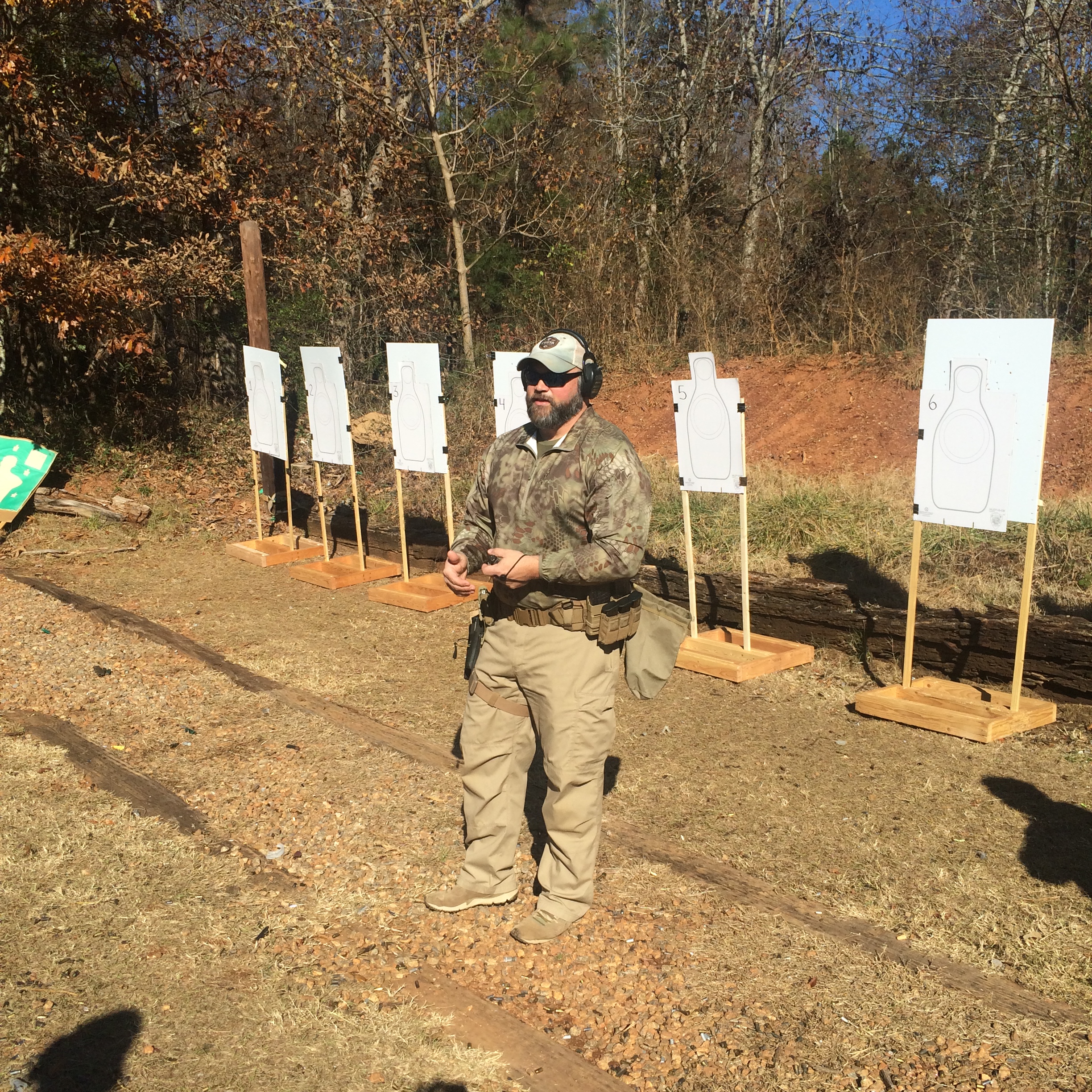 In some parts of the world, there are four seasons in a year.  That is not the case in Georgia. We have summer and not summer.  September here is summer.  The temperature on both days of this class topped the 90 degree mark, and day two included a thunderstorm in the afternoon that upped the already substantially high humidity level.  Not only did we get roasted; we were boiled a bit as well.  This presented considerable teaching challenges, but he handled them well, and the students all seemed quite pleased with the product they received. One of the breaks evolved into a lengthy question and answer session which I enjoyed very much.  During the thunderstorm, he set up barrels underneath our shelter and taught proper use of cover, well, he did until the rain started beating on the metal roof so hard that it was impossible to hear anything other than a shout.